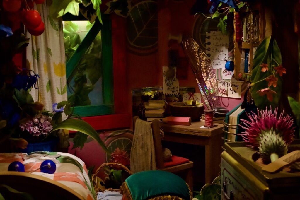 大倉庫の中で一番唸ったのはアリエッティのエリアかも知れない。他の展示に比べて何倍も時間をかけたのがすぐ分かるほど、力の入れ方が一目瞭然なのだ。普段我々が何気なく使っているどんなに小さな物も、アリエッティにしてみれば巨大なツールであり、インテリアである。アリエッティは小さな少女だが、あるいは彼女以下のサイズの虫のように体が小さくなると世界はどんな風に見えるのか。そのスケール感は実際にその世界に溶け込み、実物で体験してみないと気が付かないだろう。これぞジブリパークの醍醐味。