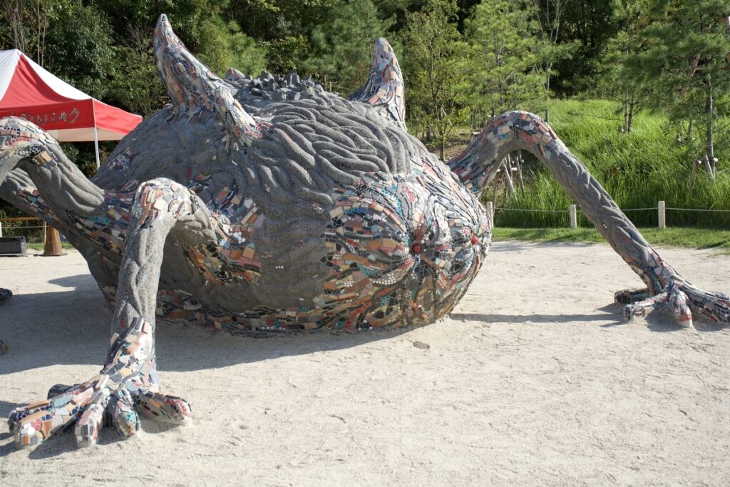 もののけの里でとりわけ目をひいたのはタタリ神だ。そう、もののけ姫の冒頭から登場している、みんなのトラウマである。なんならあいつのせいで「もののけ姫って面白いけどあいつまた見るの嫌やな…」と、なぜかもののけ姫自体に否定的になってしまったほどだ。実物を見ればその禍々しさも画面の中で見る時の数倍。そのキモい見た目だけでなく、作中のスピードもそういえばキモかった。登場するヤックルはざっくりモデルがカモシカで、そのカモシカが走るスピードは30~40km/h。その全力ヤックルとほぼ並走できているタタリ神。つまりあいつはもし動いたら40km/hもの速さで我々に対して突っ込んでくるのだ。アシタカ、そなたはこんなえげつないバケモンと戦っていたのか…。
